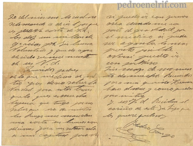 Queridos padres despues desaludarles paso adecirles que oy herecibido lasuya con fecha 19 del mismo por loquecreo queno tiene no vedad pero lo que me causa mucha pena es mi tio paco que me parece que yano lo vere pues yo selo pedire ami capitan aversi puedo lograr el permiso para verlo sipuedo.