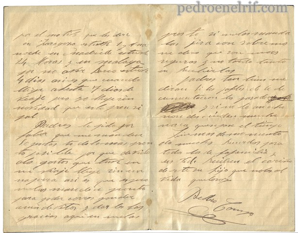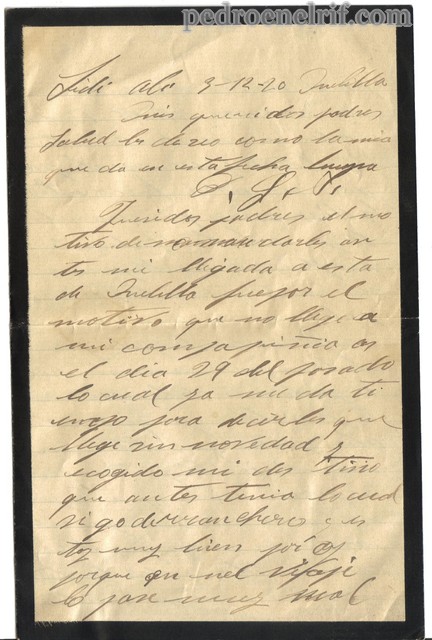 Queridos padres el motivo de no mandarles antes mi llegada a esta de Melilla fuepor el motivo que no llege a mi compañia en el dia 29 del pasado lo cual ya me da tiempo para decirles que llege sin novedad y ecogido mi des tino que antes tenia lo cual sigo derranchero y estoy muy bien por oy porque en el viaje lo pase muy mal por el motivo que