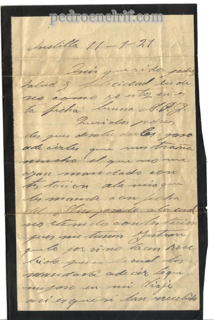 Queridos padres después desalu darles paso ade cirles que mestraña mucho el que no me ayan mandado contestación ala mia que les mande con fecha del Año pasado a la cual no etenido contestación pues me tienen intranquilo por si no la an recibido pues en la cual les mandava decir lo que mepaso en mi viaje asi es que si han recibido espero me manden lo que les pedia y si no allegado a queles digo que me manden 50 pesetas todolomas pronto posible porque quiero pagar lo que devo amis amigos asi es que espero me los mandaran deseguida y les pido por favor que me contes ten abuelta de Corrios diciéndome como están los papeles esos mios que nose nada aversisepasa el tiempo y nosepueden arreglar.