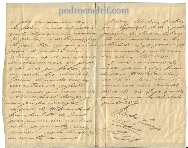 En esta carta muestra su pesar por la tardanza en recibir el dinero pedido y menciona a Gonzalo, probablemente quien luego fuera su cuñado: Gonzalo Mur Turmo, hermano de su futura mujer Antonia, que también sirvió en África.