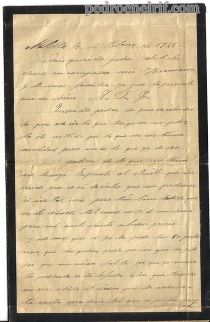 En esta carta Pedro cita una serie de gestiones que han de hacer sus padres, probablemente para la aceptación del legado de su tío «Paqued». Los padres le habían reprochado haber vendido barato el aceite (¿el que recibió de su tío?) y él se justifica. Cita las gestiones que han de hacer para el arreglo de «los papeles», donde se adivinan discrepancias con sus padres, a quienes advierte que un compañero le ha asesorado bien. Probablemente esta carta se cruzó con el correo certificado mandado por su madre el 27 de enero.