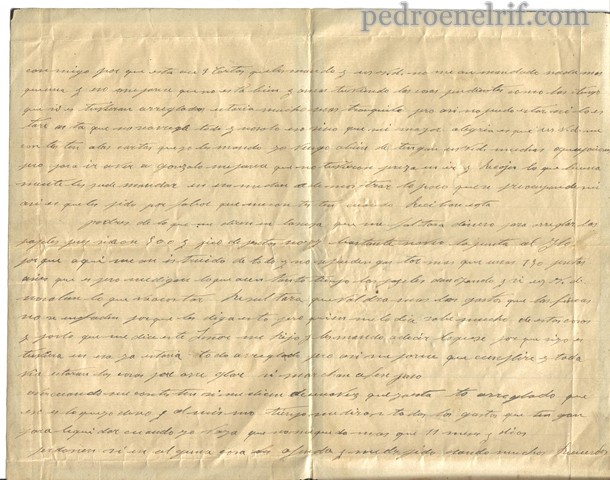 Avercuando me contes ten si me dicen deunavez queyaesta to arreglado que eso es lo queyo deseo y al mismo tiempo me diran todos los gastos que ten gan para liquidar cuando yo vaya que nomequeda mas que 11 meses y días perdonen si en alguna cosa les ofendo y medes pido dando muchos recuerdos para mis Hermanos y Hermana y los niños y demás que por mi les pregunten y ustedes reciban el mas cariñoso abrazo de este su hijo que les quiere y verles desea que lo soy.