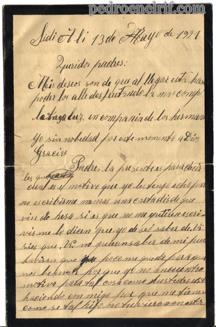 Padres la presente es para decirles cual es el motivo que yo les tengo echo para no escribirme nomas una carta disde que vin de hesa si es que no me quieren escribir me lo dicen que yo deseo saber de Vs sies que Vd no quieren saber de mi pues havisan que poco me queda para que nos veamos por que yo no ancuentro motivo para tal cosa como hustedes están haciendo con migo por que me tienen como si tal hijo no tuvieran en esta tierra de Africa yo vien pasara sin escribir porque ya me tienen hustedesengañado de todo pero al mismo tiempo se que hustedes son padres lo que les boy a demostrar lo que hustedes no deben saber que yo soy hijo y si lo saben no lo dan a demostrar, ya me diransi en que les tengo faltao yo para que hagan heso conmigo ho el porque es que yo les digo que no lo se.