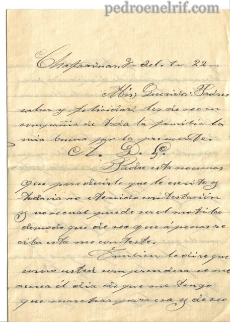 Esta es la última carta que se conserva. Se acerca la licencia y la escribe al día siguiente de la anterior, por si acaso no llegaba; insiste en pedir dinero, en especial por si quiere su padre que le lleve tabaco en su regreso a Costean. Como avisó en la anterior repite carta por si la primera no llega.