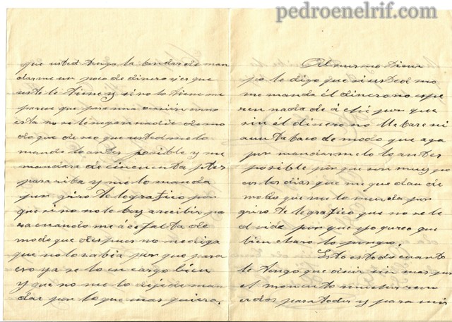 Tambien le dire que como usted comprenderá se me acerca él dia de que me tengo que marchar para esa y deseo que usted tenga la bondad de mandarme un poco de dinero si es que uste le tiene y si no lo tiene me paceré que para una ocasión como esta no se le negara nadie demodo que deseo que usted me lo mande lo antes posible y me mandara de cincuenta ptas para riba y me lo manda por giro telegráfico por que si no no le boy arecibir para cuando me ácefalta de modo que después no me diga que no lo sabia porque para eso ya se lo en cargo bien y que no me lo dejede mandar por lo que mas quiera.