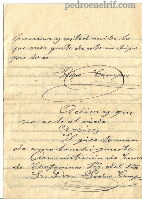 El giro lomanda como ba achi puesto. Arministracion de Correos de Chafarinas. 1º del 1º. Sr. D. Pedro Campos