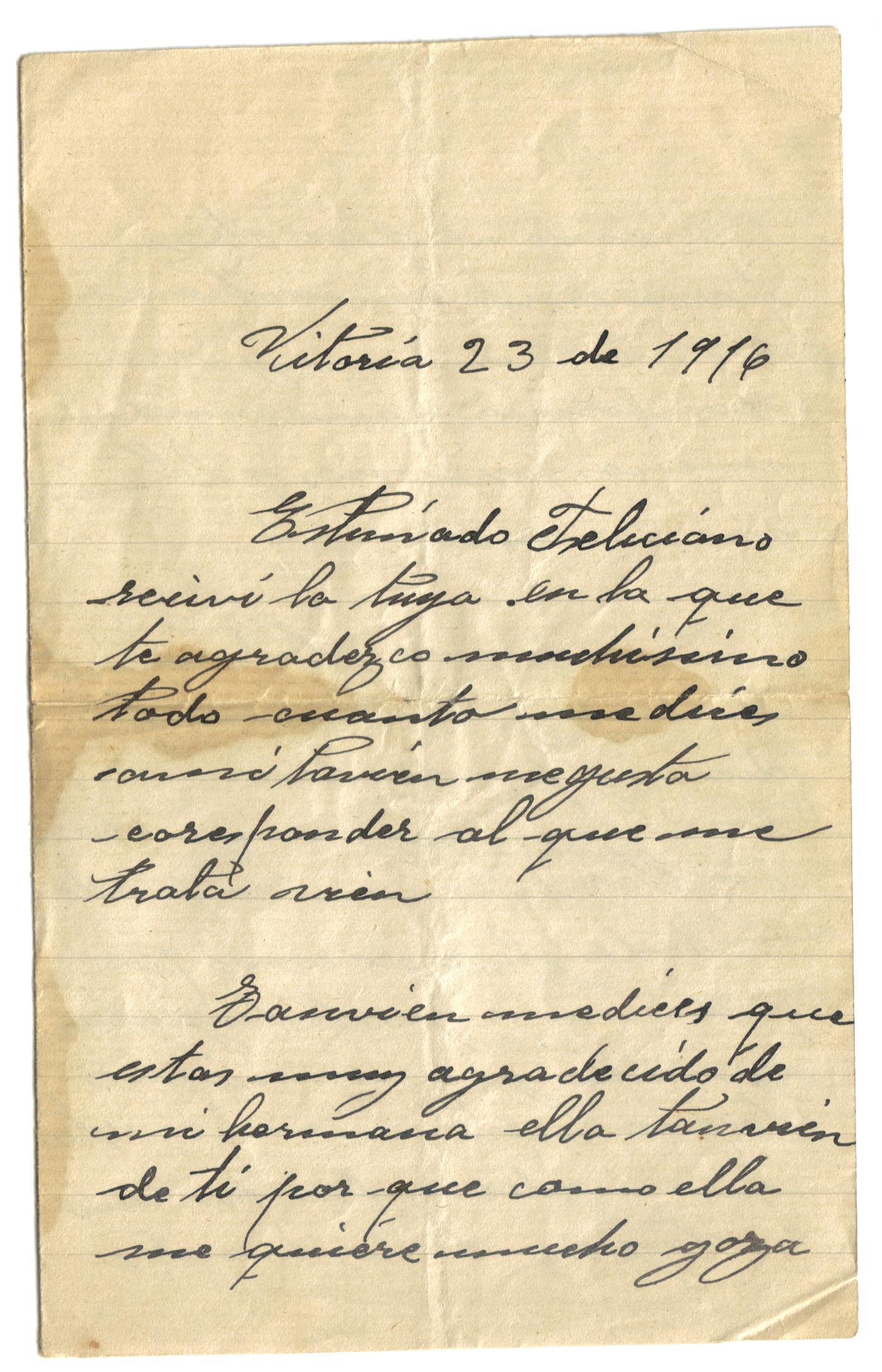 En 1.916, destinado en Vitoria, conoció a Inés quien mandó a Feliciano esta carta de amor (en correspondencia «al que me trata vien»):