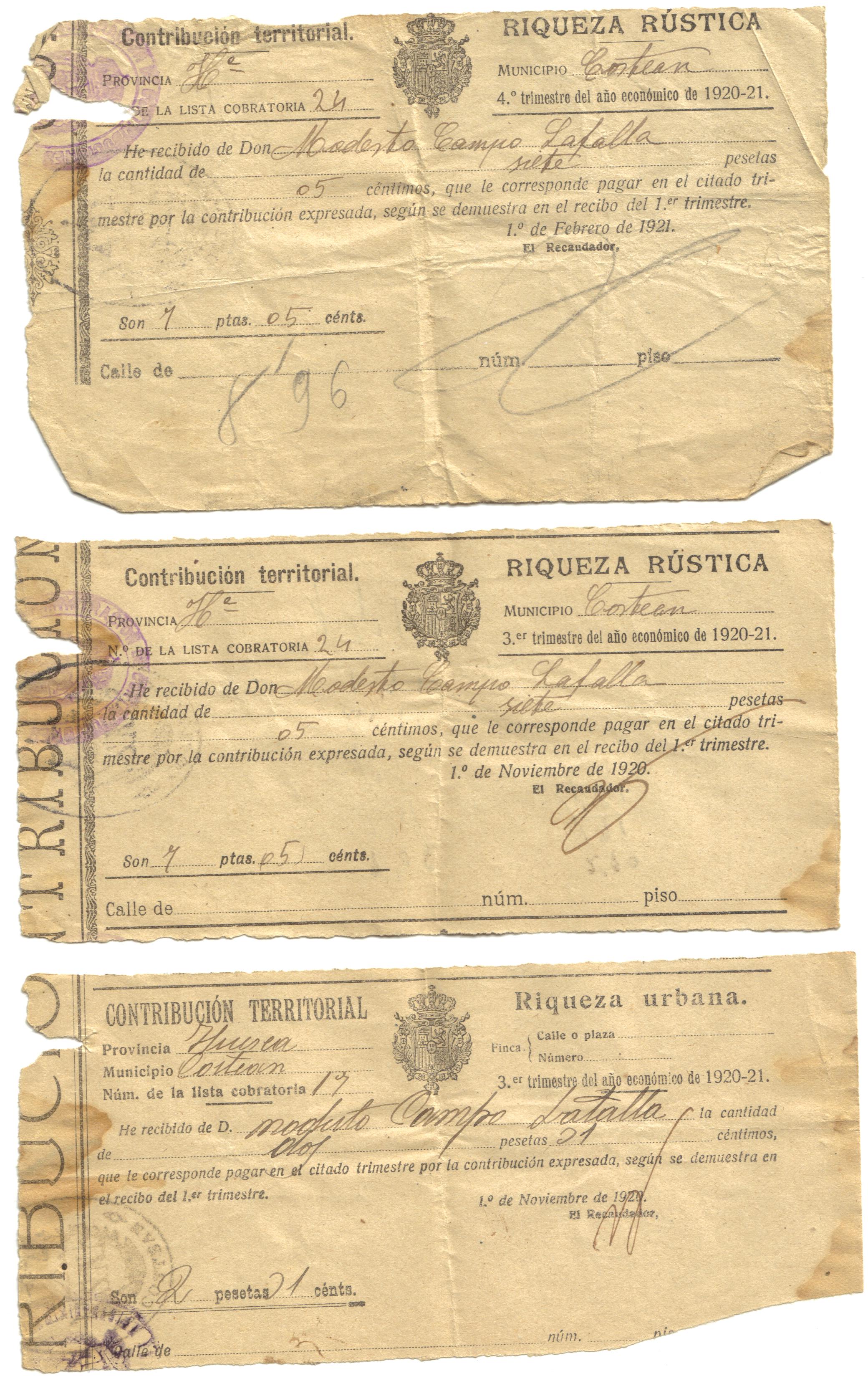 Sus padres fueron Modesto Campo Lafalla y Encarnación Solano Sin. El padre tenía como poco una propiedad rústica y otra urbana, según estos recibos de contribución de 1.920 y 1.921: